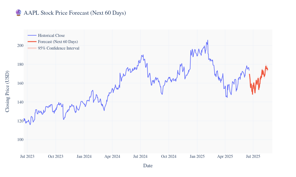 This project demonstrates advanced time series forecasting techniques applied to Apple stock price prediction. Using historical stock data spanning 15 years, I implemented a SARIMAX (Seasonal AutoRegressive Integrated Moving Average with eXogenous regressors) model to capture both trend and seasonal patterns in the stock price movements.